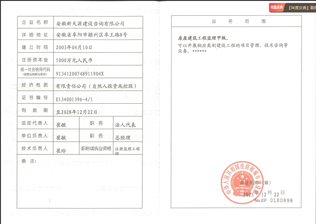 安徽新天源建設咨詢有限公司是一家全過程項目管理咨詢機構,重點開展PPP項目咨詢、BIM項目咨詢、招標代理、工程造價、工程監理、工程咨詢等業務。 公司成立于2003年4月10日,為股份制企業,現注冊資金5000萬元,辦公面積2200多平方米,法人代表崔敏。在成立同年,公司取得了國家發展改革委員會頒發工程咨詢資格證書,并成為安徽省工程咨詢協會會員單位。隨著近年來的不斷發展壯大,公司相繼取得了招標代理資質證書(工程招標代理資質資格證書、政府采購代理資格證書、水利工程招標代理資格證書、中央投資項目招標代理資質證書)。 2008年11月取得工程造價資質證書并成為阜陽市審計局審計協審定點單位; 2012年3月取得安徽省發改委固定資產節能評估資質證書; 2012年3月取得安徽省國土資源廳測繪資質證書; 2012年7月獲得安徽省經濟和信息化委員會第一批工業投資項目節能評估機構備案; 2012年9月取得水利工程監理資質證書; 2014年1月取得工程監理資質證書;現工程招標代理及工程造價已取得甲級資質,并開展了環境影響評價、工程測量、房地產評估等業務。
